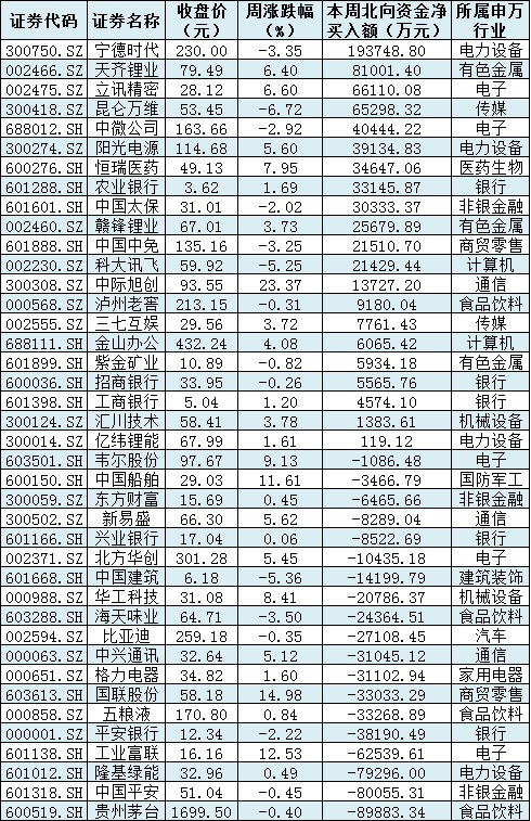 資金方面,周五(5月19日),北向資金凈賣出金額達22.26億元。本周,北向資金累計凈賣出金額達16.91億元,從前十大成交活躍股來看,寧德時代、天齊鋰業(yè)、立訊精密、昆侖萬維等4只個股北向資金凈買入金額均超6億元。另外,貴州茅臺、中國平安、隆基綠能等個股遭北向資金凈賣出金額均超7億元。
