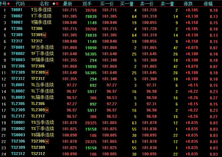 周五,國債期貨全線收漲,30年期主力合約漲0.23%,10年期主力合約漲0.13%,5年期主力合約漲0.10%,2年期主力合約漲0.03%。