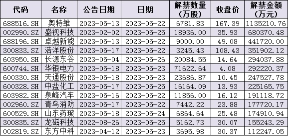 統(tǒng)計顯示,下周(5月22日-26日)共有69家公司限售股陸續(xù)解禁,按最新收盤價計算,解禁市值為543.62億元。從解禁市值來看,奧特維(113.52億元)、盛視科技(68.04億元)等公司解禁金額均超60億元。