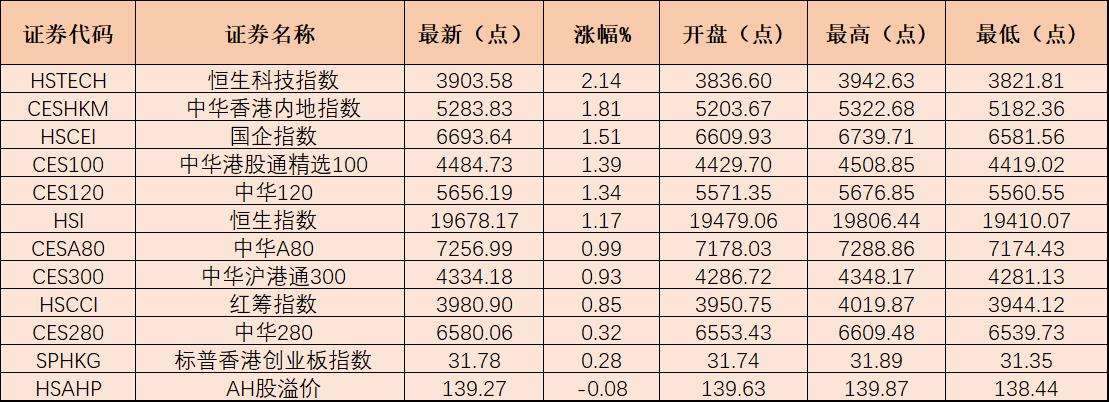 今日,港股市場全天表現(xiàn)強勢,主要指數(shù)普遍上漲,截至收盤,恒生指數(shù)漲1.17%,報19678.17點;恒生科技指數(shù)漲2.14%,報3903.58點;國企指數(shù)漲1.51%,報6693.64點。
