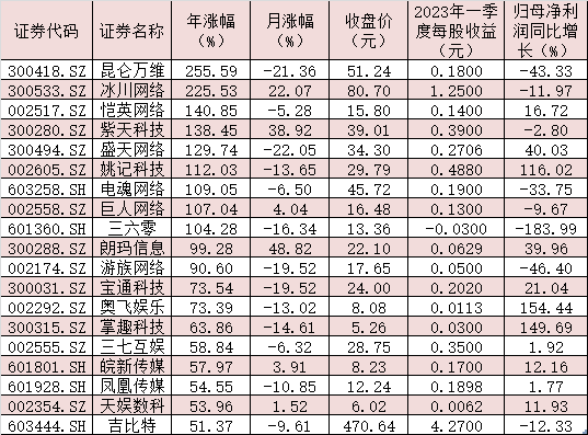 今年以來,截至5月23日,游戲板塊表現(xiàn)強(qiáng)勢,其整體漲35.58%,跑贏上證指數(shù)(年內(nèi)累計(jì)漲5.08%)。其中,昆侖萬維、冰川網(wǎng)絡(luò)、愷英網(wǎng)絡(luò)、紫天科技、盛天網(wǎng)絡(luò)、姚記科技、電魂網(wǎng)絡(luò)、巨人網(wǎng)絡(luò)、三六零等9只概念股年內(nèi)股價(jià)實(shí)現(xiàn)翻番。