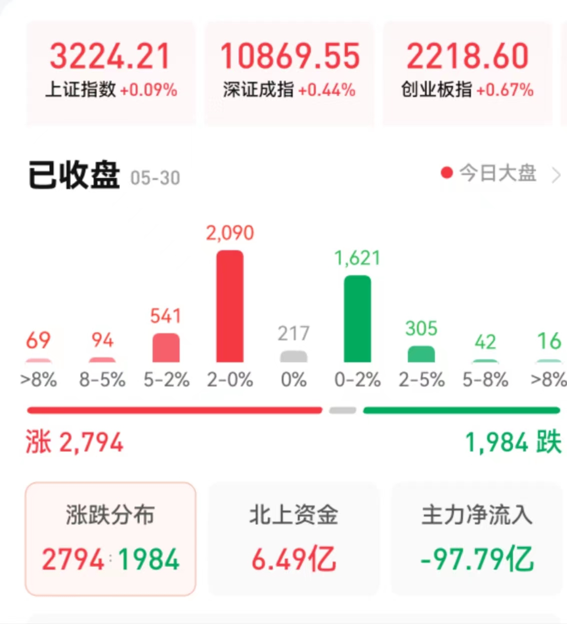 周二(5月30日),A股三大股指上演了V型反轉(zhuǎn)的走勢,探底回升,全線翻紅。截至收盤,上證指數(shù)微漲0.09%報3224.21點,深證成指漲0.44%報10869.55點,創(chuàng)業(yè)板指漲0.67%報2218.6點;兩市合計成交金額達9332億元,北向資金凈買入6.49億元??傮w上看,兩市個股漲多跌少。其中,漲停個股達51只,跌停個股達25只。