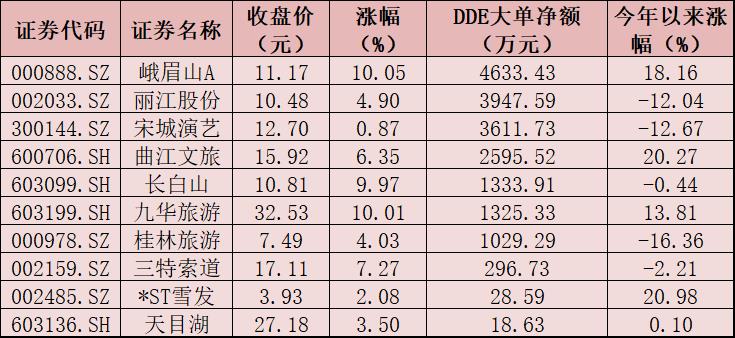 表:5月31日獲大單資金凈買入的景點(diǎn)及旅游股一覽