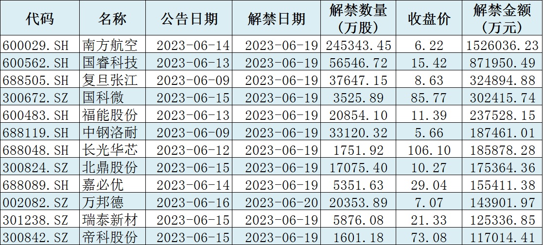 與此同時(shí),據(jù)同花順統(tǒng)計(jì)顯示,下周(6月19日-23日)共有64家公司限售股陸續(xù)解禁,按最新收盤價(jià)計(jì)算,解禁市值為510.1億元。從解禁市值來看,南方航空(152.6億元)、國(guó)??萍迹?7.2億元)等公司解禁金額均超80億元。
