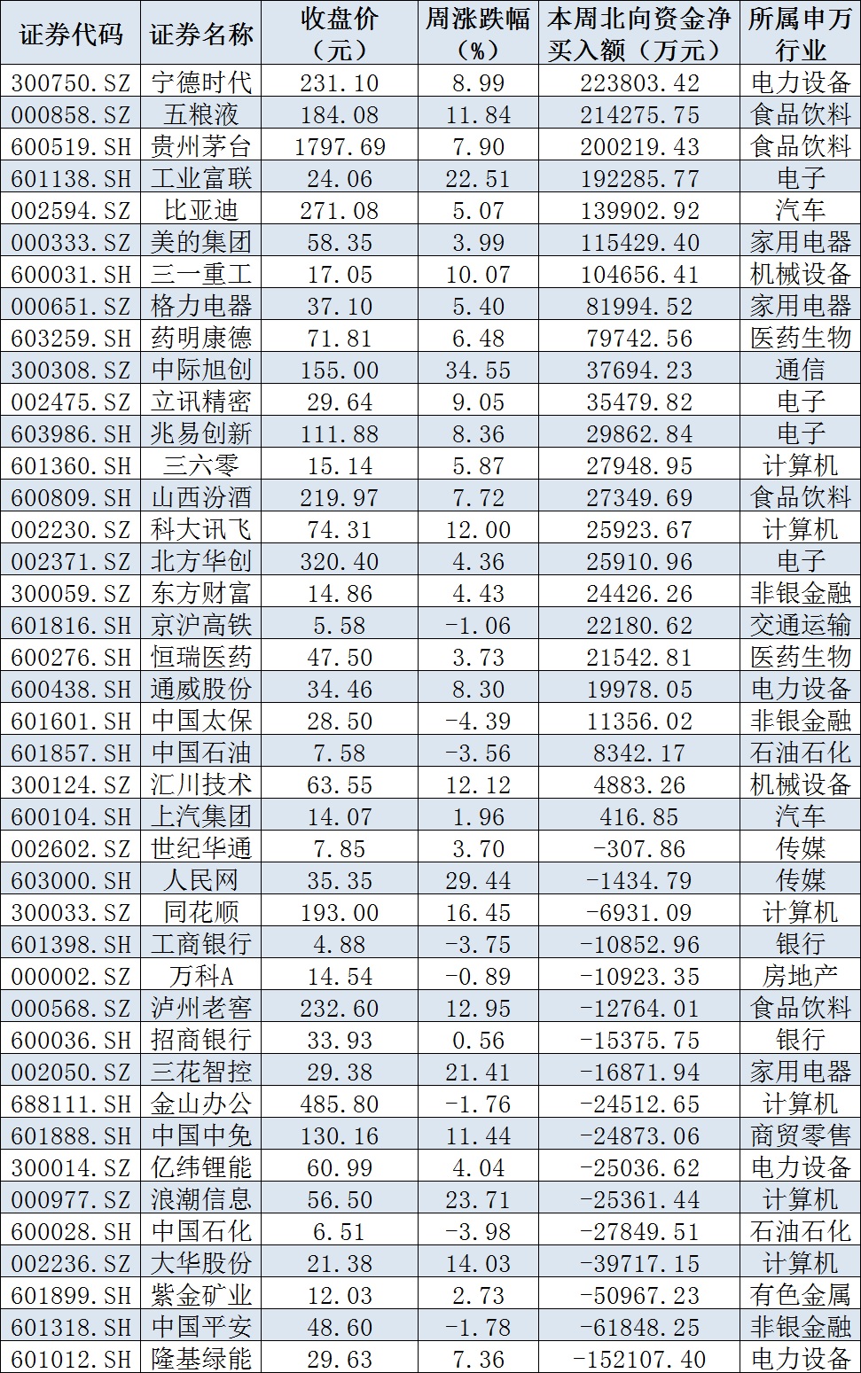 資金方面,本周,北向資金合計(jì)凈買入金額達(dá)143.91億元,創(chuàng)3個(gè)月來新高。6月16日,北向資金凈買入金額達(dá)105.46億元,為近4個(gè)月來最高。從前十大成交活躍股來看,寧德時(shí)代、五糧液、貴州茅臺(tái)等3只個(gè)股,北向資金凈買入金額均超20億元。另外,隆基綠能、中國(guó)平安、紫金礦業(yè)等個(gè)股遭北向資金凈賣出金額均超5億元。