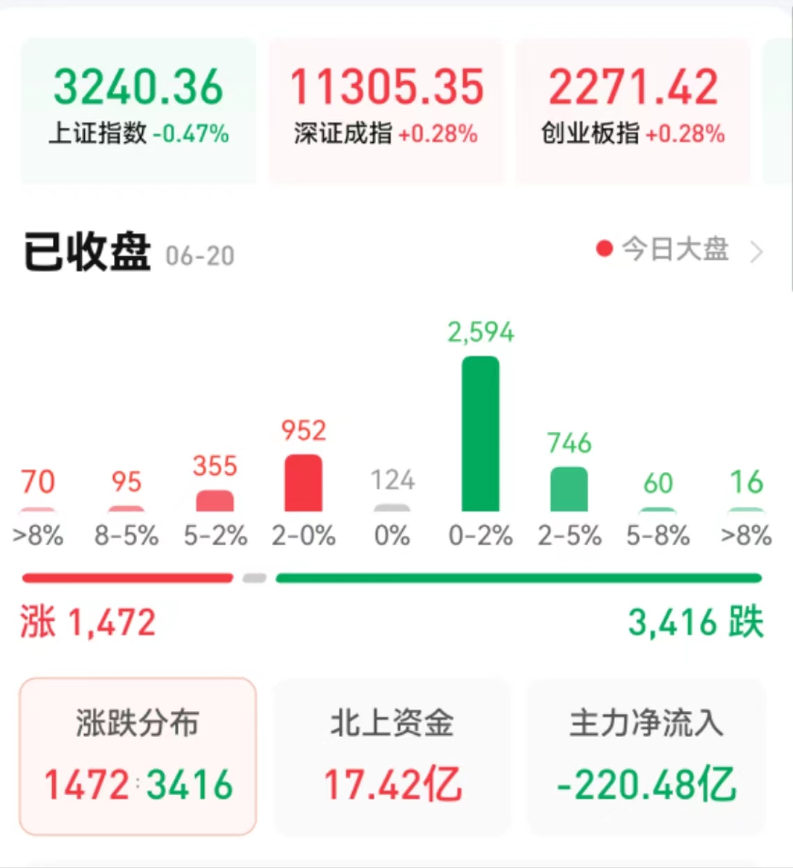 周二(6月20日),A股三大股指震蕩分化,漲跌不一。截至收盤,上證指數(shù)跌0.47%報(bào)3240.36點(diǎn),深證成指漲0.28%,報(bào)11305.35點(diǎn);創(chuàng)業(yè)板指漲0.28%,報(bào)2271.42點(diǎn);兩市合計(jì)成交10900億元,連續(xù)第5個(gè)交易日突破萬(wàn)億元;北向資金凈買入17.42億元;總體來(lái)看,A股個(gè)股跌多漲少。其中,漲停個(gè)股達(dá)42只,跌停個(gè)股達(dá)11只。
