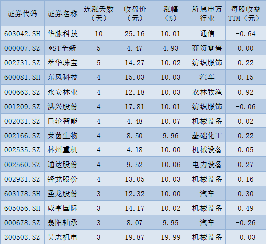 表:連續(xù)上漲3日且今日收盤(pán)漲停股一覽