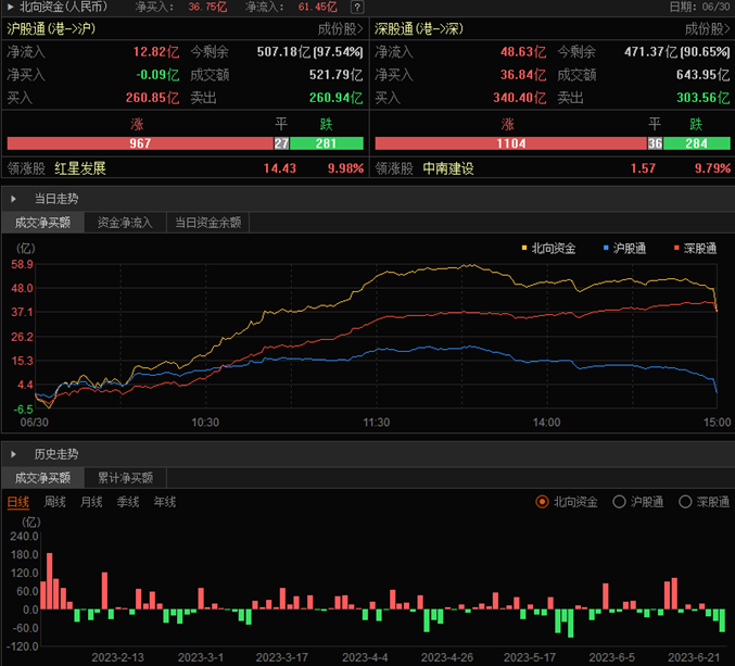 6月30日,A股三大指數(shù)震蕩上揚(yáng),滬指表現(xiàn)最弱,早盤(pán)也站上3200點(diǎn)關(guān)口,深證主板和創(chuàng)業(yè)板指均收復(fù)重要整數(shù)關(guān)口。截至收盤(pán),上證指數(shù)漲0.62%報(bào)3202.06點(diǎn);深證成指漲1.02%報(bào)11026.59點(diǎn),創(chuàng)業(yè)板指漲1.60%報(bào)2215.00點(diǎn)。A股合計(jì)成交額9204.13億元,較前一交易日增長(zhǎng)6.13%;北向資金全天凈買(mǎi)入36.75億元;其中滬股通凈流出0.09億元,深股通凈買(mǎi)入36.84億元。今日A股有3939只個(gè)股上漲,1113只下跌。