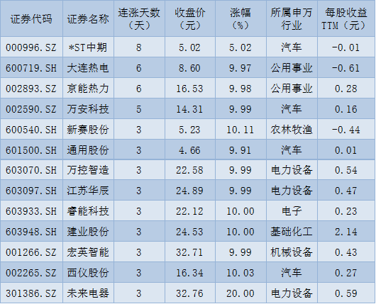 表:連續(xù)上漲3日且今日收盤漲停股一覽
