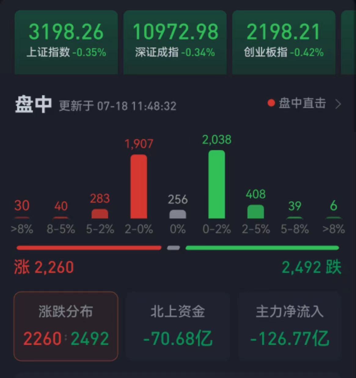 今日三大股指繼續(xù)震蕩整理。截至上午收盤,上證指數(shù)跌0.35%,報3198.26點,失守3200點整數(shù)關口;深證成指和創(chuàng)業(yè)板指分別跌0.34%和0.42%;滬深兩市合計成交額4807.8億元,總體來看,兩市個股跌多漲少。