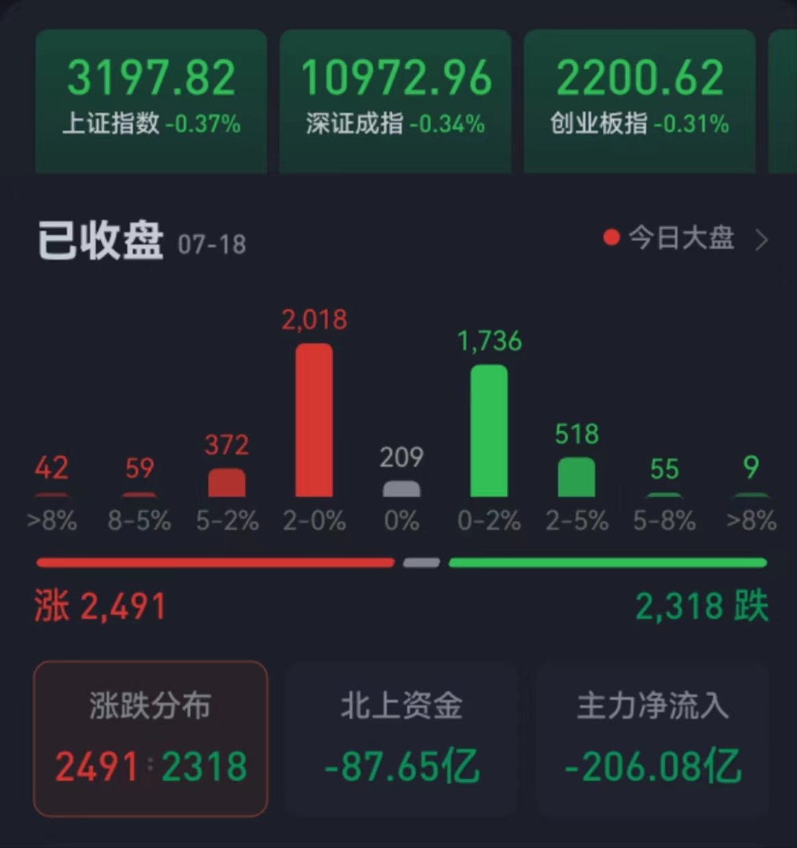 周二(7月18日),A股三大股指震蕩整理,略有下跌。截至收盤,上證指數(shù)跌0.37%報(bào)3197.82點(diǎn),深證成指跌0.34%報(bào)10972.96點(diǎn),創(chuàng)業(yè)板指跌0.31%報(bào)2200.62點(diǎn);兩市合計(jì)成交金額達(dá)7771.3億元,北向資金凈賣出87.65億元。