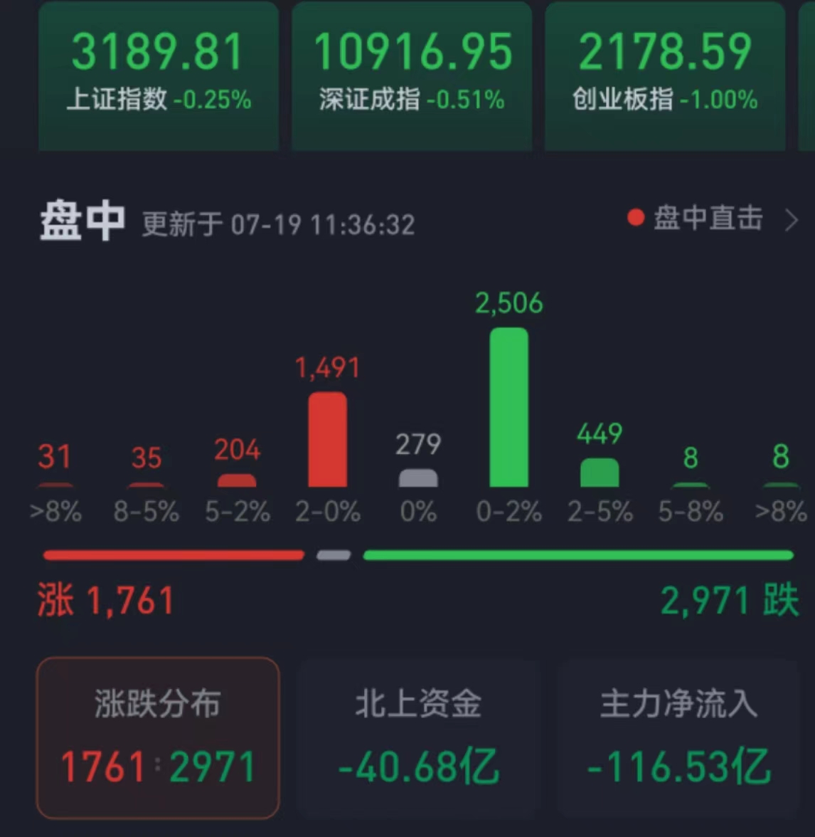 周三(7月19日),三大股指繼續(xù)震蕩整理。截至上午收盤,上證指數(shù)跌0.25%,報3189.81點(diǎn);深證成指和創(chuàng)業(yè)板指分別跌0.51%和1%;滬深兩市合計成交額4295.1億元,總體來看,兩市個股跌多漲少。