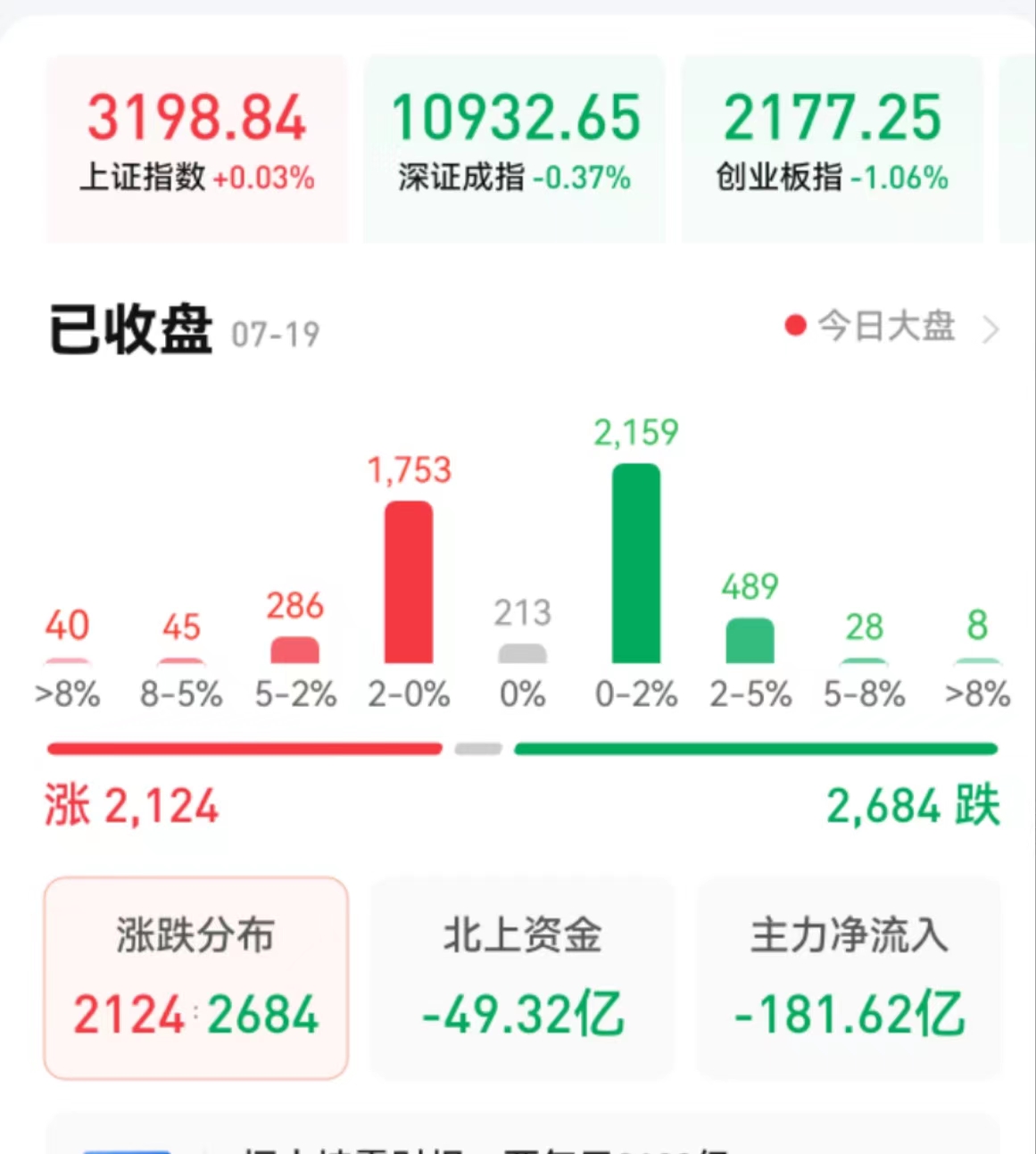 周三(7月19日),A股三大股指震蕩分化,漲跌不一。截至收盤,上證指數(shù)微漲0.03%報(bào)3198.84點(diǎn),深證成指跌0.37%報(bào)10932.65點(diǎn),創(chuàng)業(yè)板指跌1.06%報(bào)2177.25點(diǎn),上證50指數(shù)漲0.22%;兩市合計(jì)成交7024.54億元,北向資金凈賣出49.32億元??傮w上看,兩市個股跌多漲少。其中,漲停個股22只,跌停個股2只。