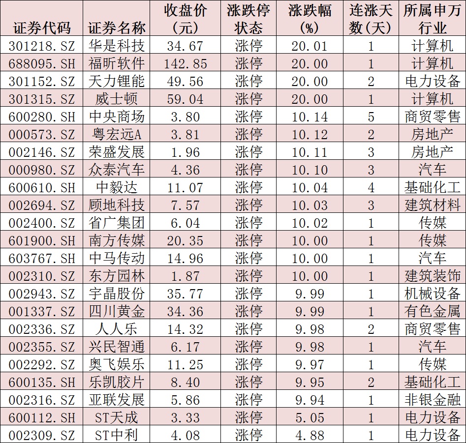 表:今日收盤漲停個股情況: