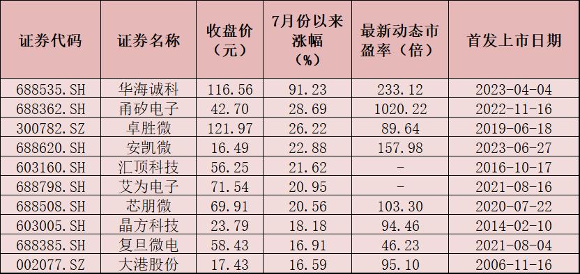 表:7月份以來漲幅居前十的半導(dǎo)體概念股一覽