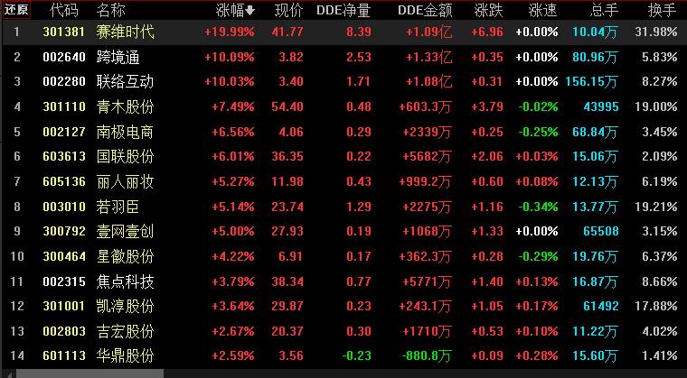 具體看,同花順統(tǒng)計顯示,截至7月20日上午收盤,互聯(lián)網(wǎng)電商板塊漲幅居首,達4.96%,資金凈流入達23.25億元。其中,賽維時代20CM漲停,跨境通和聯(lián)絡(luò)互動等概念股漲幅均超10%。