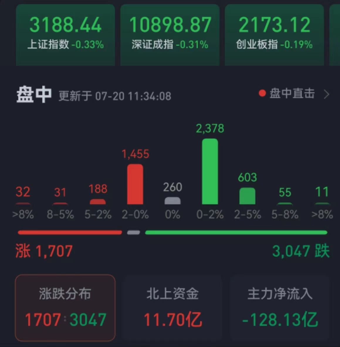 周四(7月20日),三大股指繼續(xù)震蕩整理。截至上午收盤,上證指數(shù)跌0.33%,報3188.44點;深證成指和創(chuàng)業(yè)板指跌幅分別為0.31%和0.19%;滬深兩市合計成交額4553.7億元,總體來看,兩市個股跌多漲少。