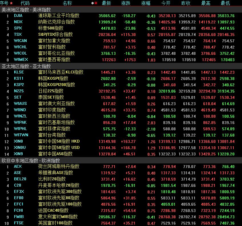 周五,美國三大股指全線收跌,道指跌0.43%報(bào)35065.62點(diǎn),標(biāo)普500指數(shù)跌0.53%報(bào)4478.03點(diǎn),納指跌0.36%報(bào)13909.24點(diǎn)。本周,道指跌1.11%,標(biāo)普500指數(shù)跌2.27%,納指跌2.85%。