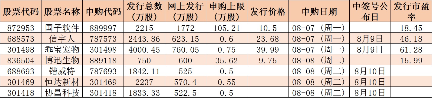 根據(jù)發(fā)行安排,下周(8月7日-11日)有7只新股發(fā)行,其中,創(chuàng)業(yè)板3只,科創(chuàng)板2只,北交所2只。具體安排如下,8月7日發(fā)行的是信宇人、乖寶寵物、國子軟件;8月8日發(fā)行的是協(xié)昌科技、鍇威特、恒達(dá)新材、博迅生物。