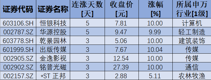 表:連續(xù)上漲3日且今日收盤漲停股一覽