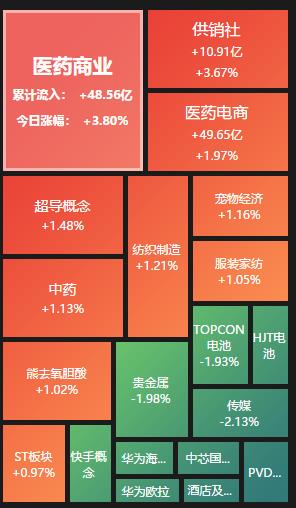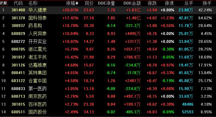 具體看,截至8月15日上午收盤,醫(yī)藥商業(yè)板塊逆市崛起,漲幅居首達(dá)3.80%,資金凈流入48.56億元。其中,華人健康20CM漲停、國科恒泰、藥易購、人民同泰、開開實(shí)業(yè)等概念股漲幅均超10%。