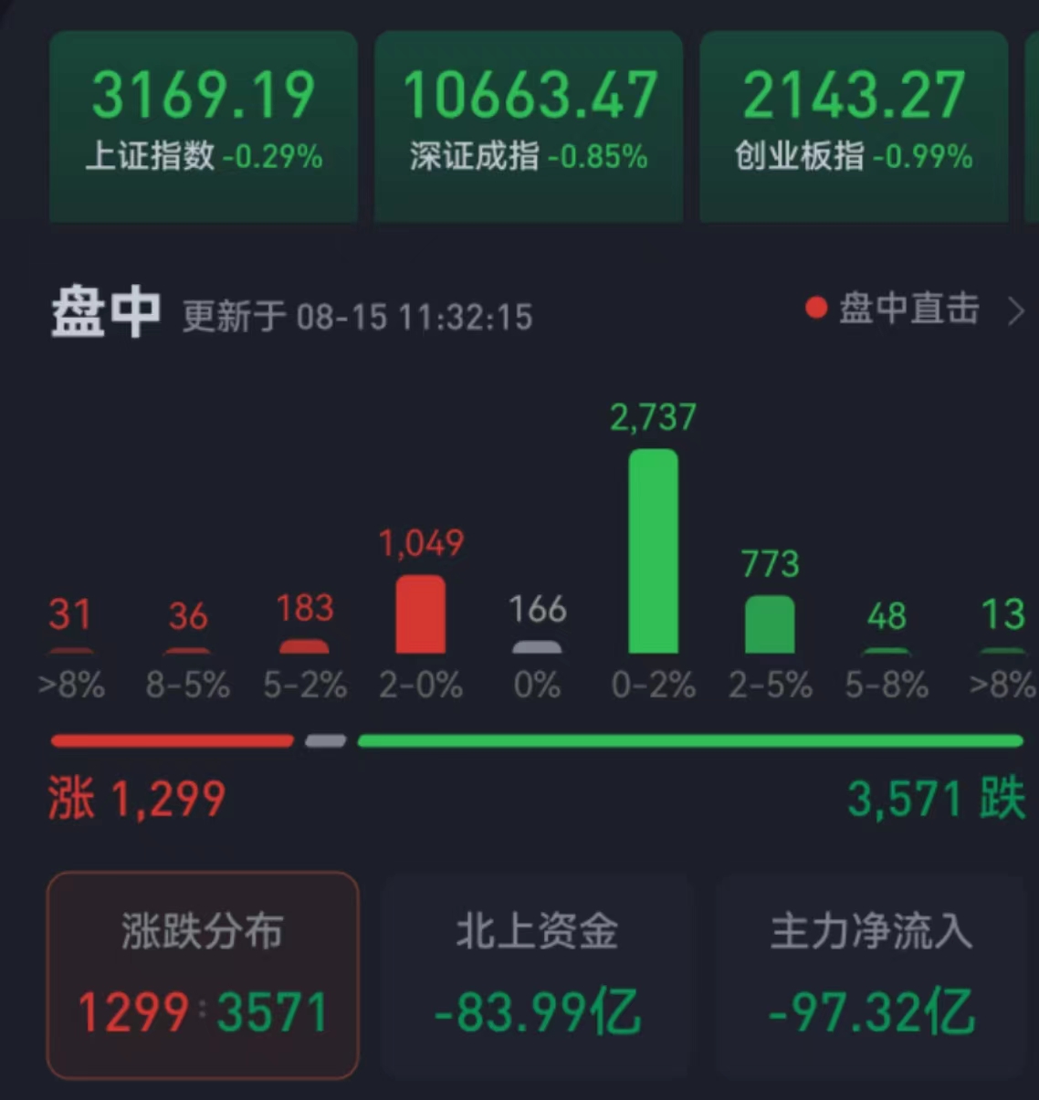 周二(8月15日),三大股指繼續(xù)震蕩整理。截至上午收盤,上證指數(shù)跌幅達(dá)0.29%,報(bào)3169.19點(diǎn);深證成指和創(chuàng)業(yè)板指跌幅分別為0.85%和0.99%;滬深兩市合計(jì)成交額4276.9億元,總體來看,兩市個股跌多漲少,下跌個股近3600只。
