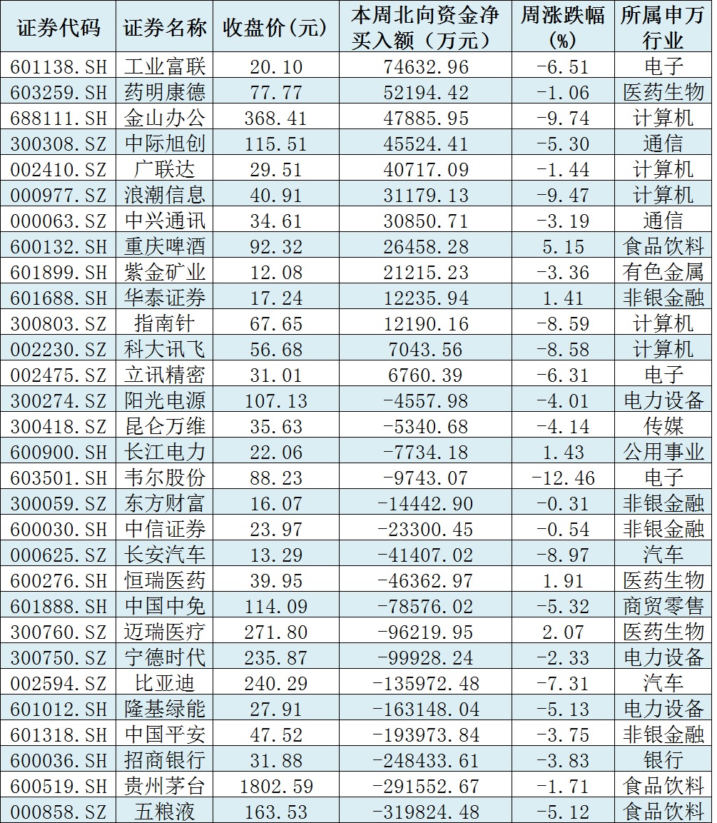 資金方面,周五,北向資金凈賣(mài)出85.22億元,已連續(xù)10個(gè)交易日凈賣(mài)出,創(chuàng)歷史最長(zhǎng)連續(xù)凈賣(mài)出天數(shù)紀(jì)錄。本周北向資金累計(jì)凈賣(mài)出金額達(dá)291.16億元。從前十大成交活躍股來(lái)看,本周,工業(yè)富聯(lián)、藥明康德等2只個(gè)股,北向資金凈買(mǎi)入金額均超5億元。另外,五糧液、貴州茅臺(tái)、招商銀行等3個(gè)股遭北向資金凈賣(mài)出金額均超20億元。