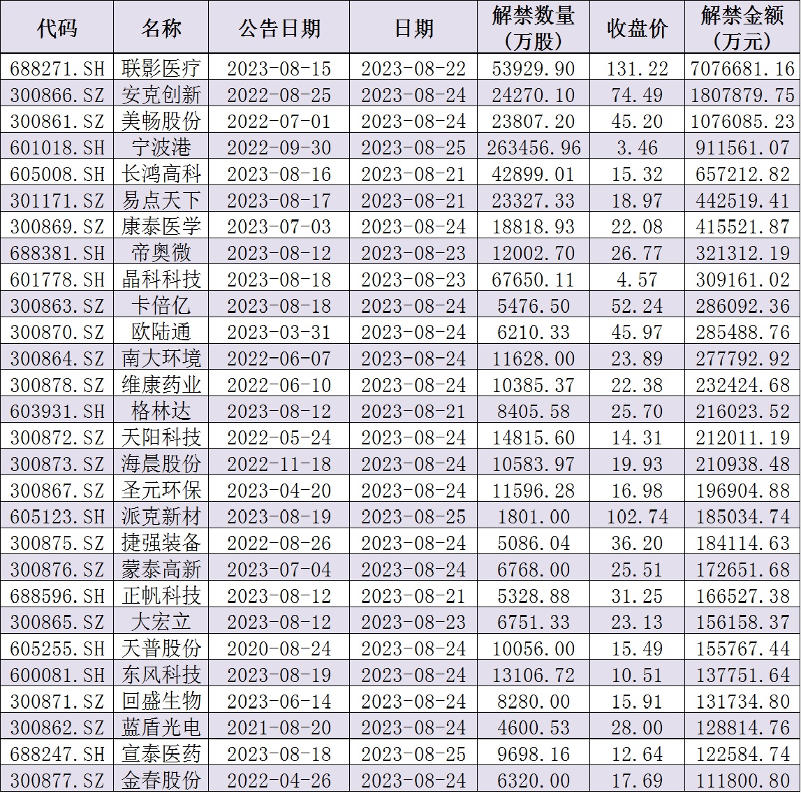 與此同時(shí),據(jù)同花順統(tǒng)計(jì),下周(8月21日-25日)共有69家公司限售股陸續(xù)解禁,按最新收盤(pán)價(jià)計(jì)算,解禁市值為1740.02億元。從解禁市值來(lái)看,聯(lián)影醫(yī)療(707.67億元)、安克創(chuàng)新(180.79億元)、美暢股份(107.61億元)等公司解禁金額均超100億元。