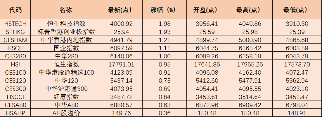 表:8月22日港股重要指數(shù)表現(xiàn)一覽