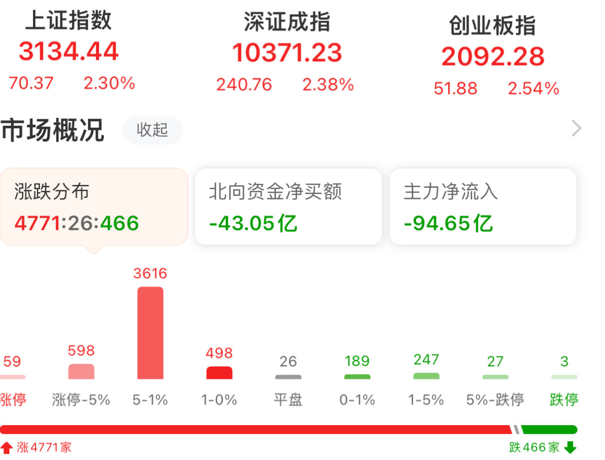 周一(8月28日),三大股指集體大漲。截至上午收盤,上證指數(shù)漲2.3%,報3134.44點;深證成指和創(chuàng)業(yè)板指分別漲2.38%和2.54%;滬深兩市合計成交額7776.23億元,總體來看,兩市個股漲多跌少,4771只個股上漲,466只個股下跌。其中,59只個股漲停,3只個股跌停。