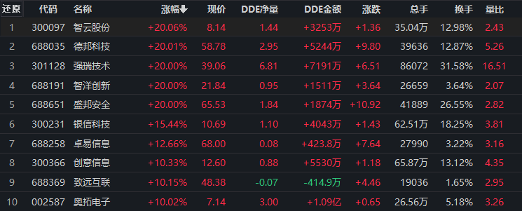 行業(yè)方面,截至8月30日上午收盤,電子化學(xué)品、半導(dǎo)體及元件、其他電子、計算機應(yīng)用、通信服務(wù)等行業(yè)漲幅居前。證券、環(huán)保、養(yǎng)殖業(yè)等跌幅居前。熱點方面,華為概念漲1.84%,板塊內(nèi)智云股份、德邦科技、強瑞技術(shù)、智洋創(chuàng)新、盛邦安全紛紛20CM漲停;奧拓電子、捷榮技術(shù)、拓維信息10CM漲停。