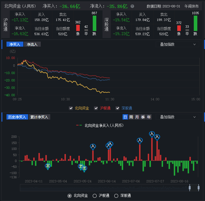 從資金面來看,8月31日上午,北向資金凈賣出36.66億元。另外,截至8月30日,滬深北三市的兩融余額合計15736.4億元,較前一交易日增加18.18億元。其中,融資余額合計14795.31億元,較前一交易日增加8.39億元;融券余額為941.09億元,較前一交易日增加9.79億元。