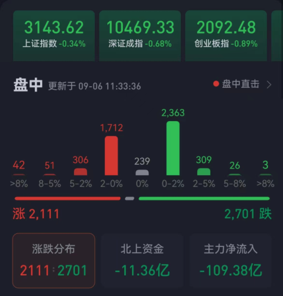 周三(9月6日),三大股指繼續(xù)震蕩整理。截至上午收盤,上證指數(shù)跌幅達0.34%,報3143.62點;深證成指和創(chuàng)業(yè)板指跌幅分別為0.68%和0.89%;滬深兩市合計成交額4356.6億元,總體來看,兩市個股跌多漲少。其中,29只個股漲停,1只個股跌停。