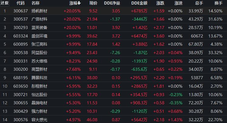 具體看,截至9月6日上午收盤,光刻膠板塊持續(xù)走強,漲幅居首達4.26%。其中,多只概念股集體漲停,揚帆新材、廣信材料、藍英裝備等概念股均達20CM漲停,盛劍環(huán)境、張江高科等個股也紛紛漲停。