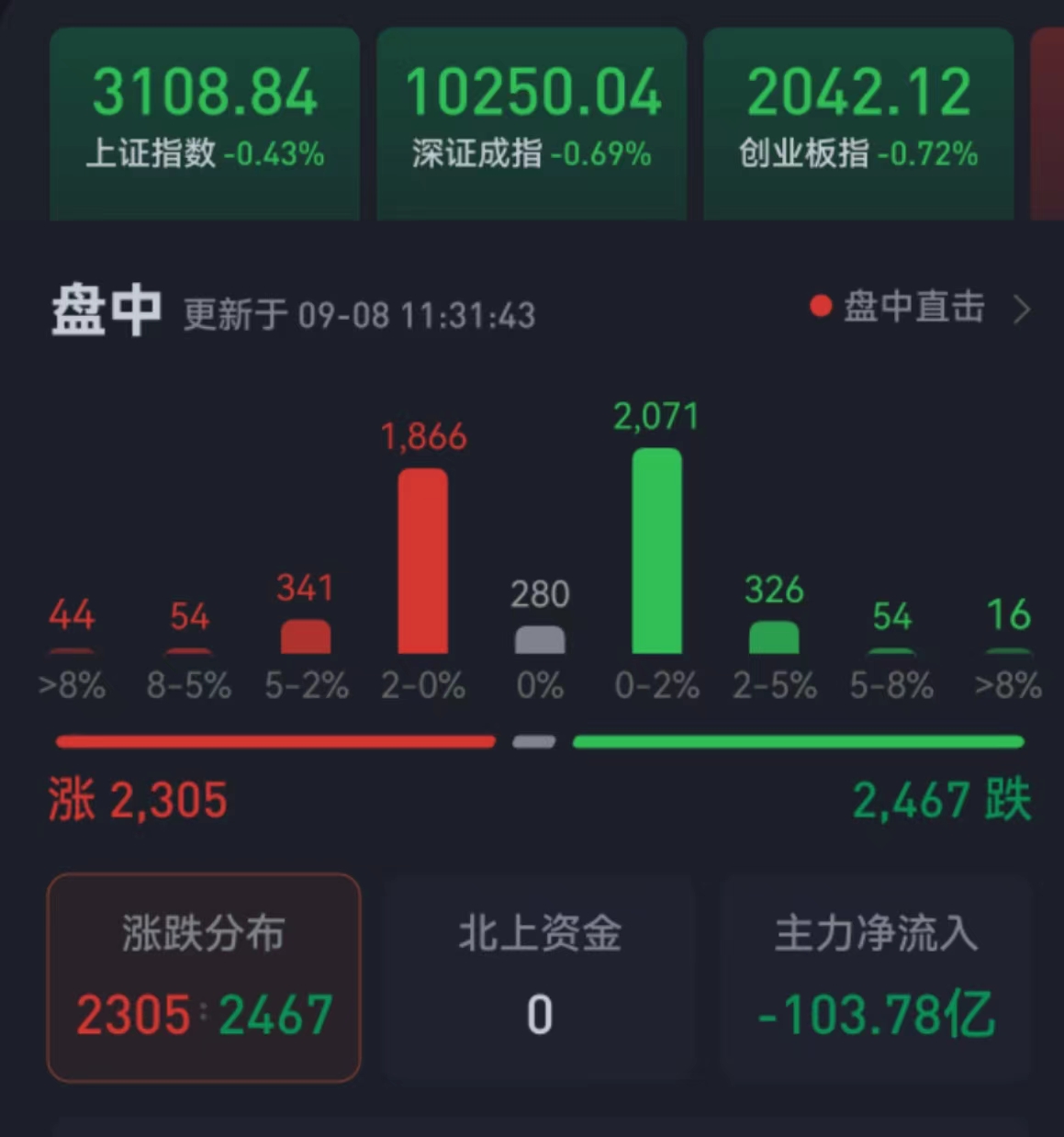 周五(9月8日),三大股指繼續(xù)震蕩回落。截至上午收盤,上證指數(shù)跌幅達0.43%,報3108.84點;深證成指和創(chuàng)業(yè)板指跌幅分別為0.69%和0.72%;滬深兩市合計成交額4050.6億元,總體來看,兩市個股跌多漲少。