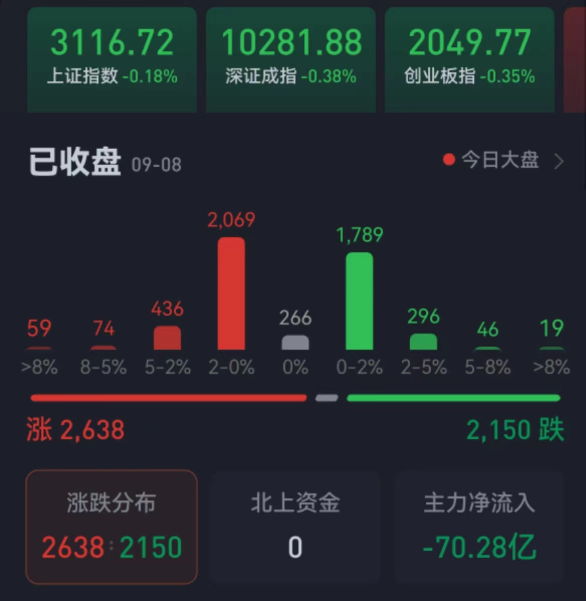 周五(9月8日),A股三大股指震蕩整理。截至收盤,上證指數(shù)跌0.18%報3116.72點,深證成指跌0.38%報10281.88點,創(chuàng)業(yè)板指跌0.35%報2049.76點;兩市合計成交金額6818.1億元。總體上看,兩市個股漲多跌少。其中,漲停個股達44只,跌停個股達5只。