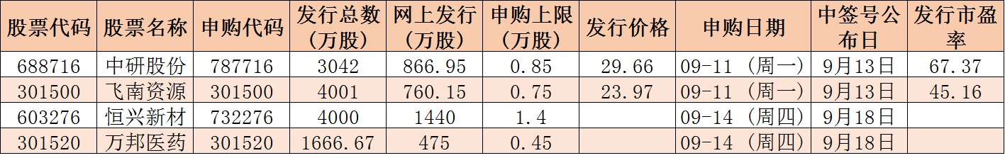 根據(jù)發(fā)行安排,下周有4只新股發(fā)行,其中,9月11日(周一)發(fā)行的是飛南資源、中研股份;9月14日(周四)發(fā)行的是恒興新材、萬(wàn)邦醫(yī)藥。