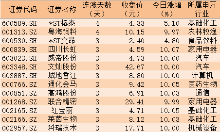表:連續(xù)上漲3日且今日以漲停價(jià)收盤的個(gè)股情況