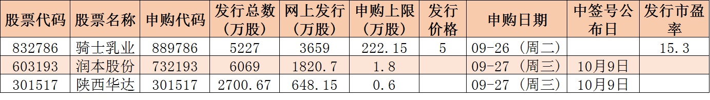 下周是長(zhǎng)假前的最后一個(gè)交易周,A股僅有4個(gè)交易日。根據(jù)發(fā)行安排,下周(9月25日-28日)有3只新股發(fā)行,其中創(chuàng)業(yè)板1只,滬市主板1只,北交所1只。具體安排如下,周二1只,騎士乳業(yè)(北交所);周三2只:潤(rùn)本股份(主板)、陜西華達(dá)(創(chuàng)業(yè)板)。
