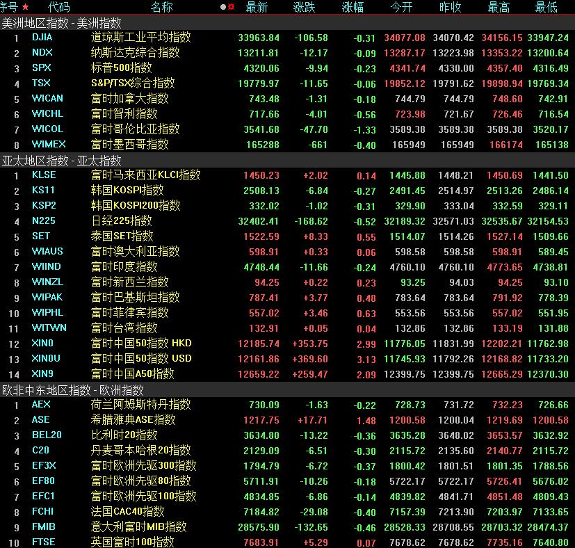 周五,美國(guó)三大股指全線(xiàn)收跌,道指跌0.31%報(bào)33963.84點(diǎn),標(biāo)普500指數(shù)跌0.23%報(bào)4320.06點(diǎn),納指跌0.09%報(bào)13211.81點(diǎn)。本周,道指跌1.89%,標(biāo)普500指數(shù)跌2.93%,納指跌3.62%。