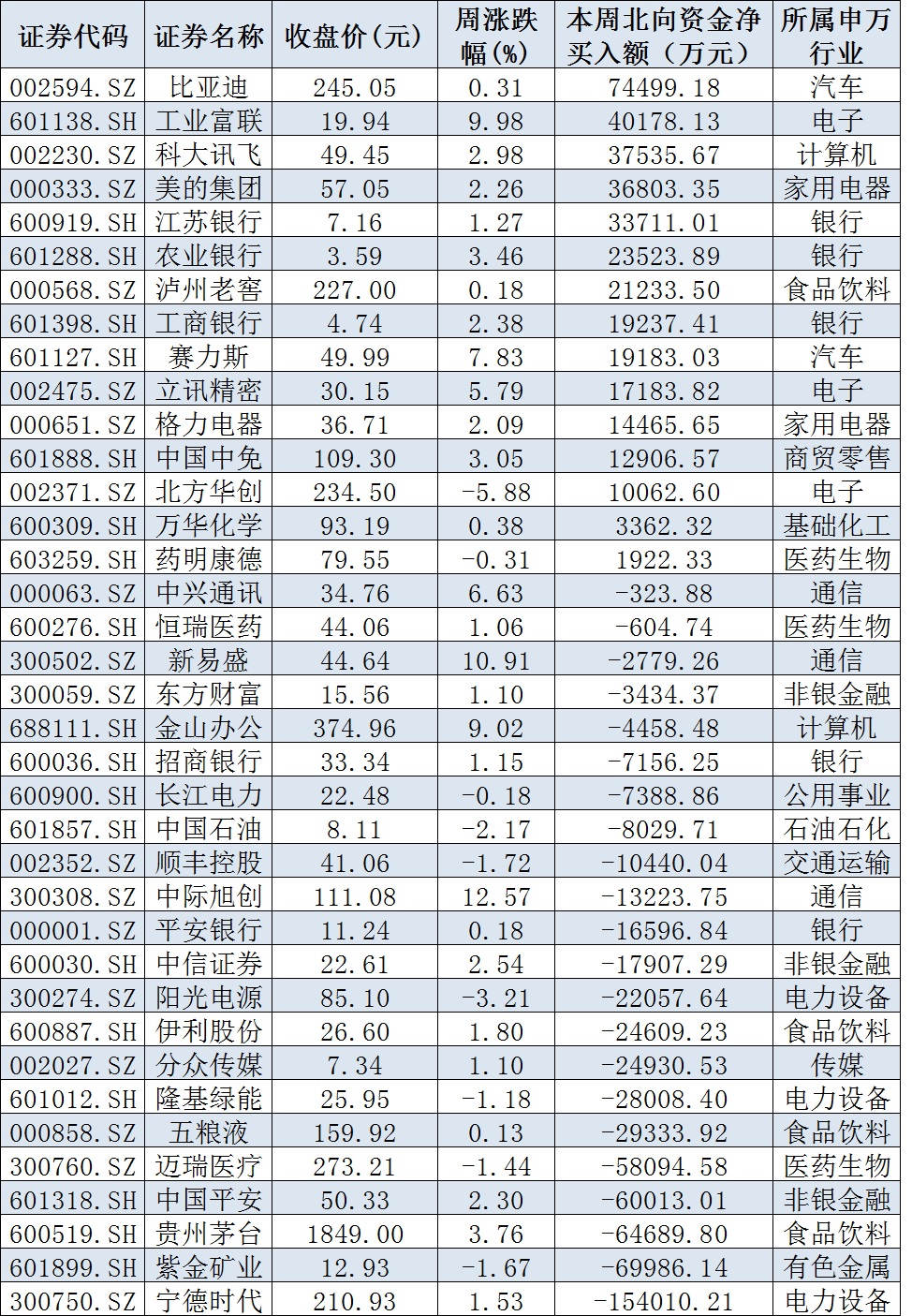 資金方面,本周北向資金累計(jì)凈買(mǎi)入金額達(dá)0.29億元,結(jié)束連續(xù)六周的凈流出,其中,滬股通凈流出4.4億元,深股通凈流入4.69億元。從前十大成交活躍股來(lái)看,本周,比亞迪、工業(yè)富聯(lián)等兩只個(gè)股,北向資金凈買(mǎi)入金額均超4億元。另外,寧德時(shí)代、紫金礦業(yè)、貴州茅臺(tái)、中國(guó)平安等個(gè)股遭北向資金凈賣(mài)出金額均超6億元。
