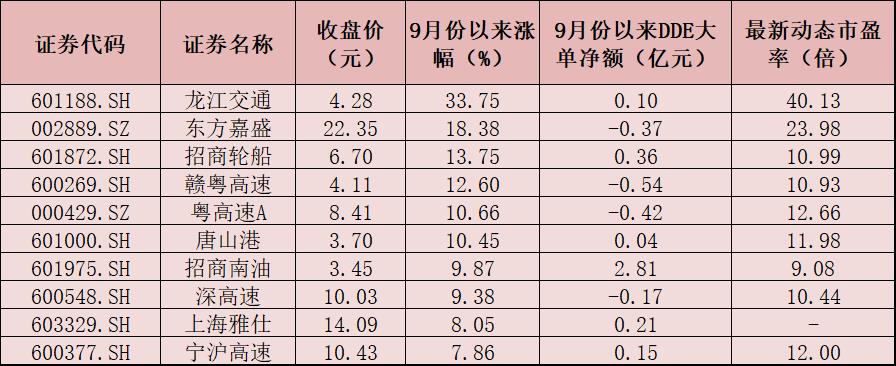 表:9月份以來漲幅居前十的交通運(yùn)輸股一覽