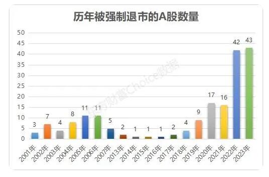 2023年行將結(jié)束,從退市公司數(shù)量來看,今年又是一個“大年”。東方財(cái)富Choice數(shù)據(jù)顯示,截至12月19日收盤,年內(nèi)已有43只A股被強(qiáng)制退市,超過2022年的42只,再創(chuàng)歷史新高。