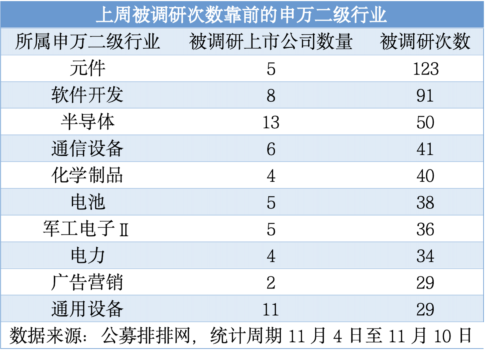元件行業(yè)最受關(guān)注,其中有5家公司合計(jì)被調(diào)研不少于123次。軟件開發(fā)、半導(dǎo)體、通信設(shè)備、化學(xué)制品、電池、電力、廣告營(yíng)銷、通用設(shè)備等行業(yè)被調(diào)研均不少于29次。
