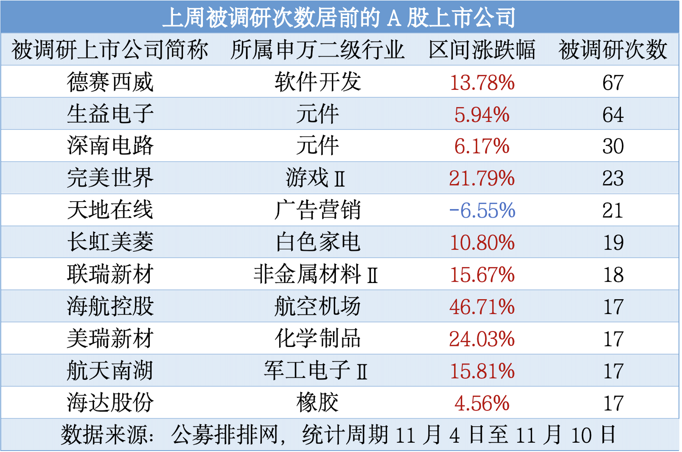 德賽西威當(dāng)周被調(diào)研67次居首,該公司主要業(yè)務(wù)涵蓋智能座艙、智能駕駛等領(lǐng)域,公司的核心主營(yíng)業(yè)務(wù)是智能座艙。此外,生益電子、深南電路、完美世界、天地在線、長(zhǎng)虹美菱、聯(lián)瑞新材、海達(dá)股份、海航控股、航天南湖、美瑞新材等被調(diào)研次數(shù)居前,均不少于17次。