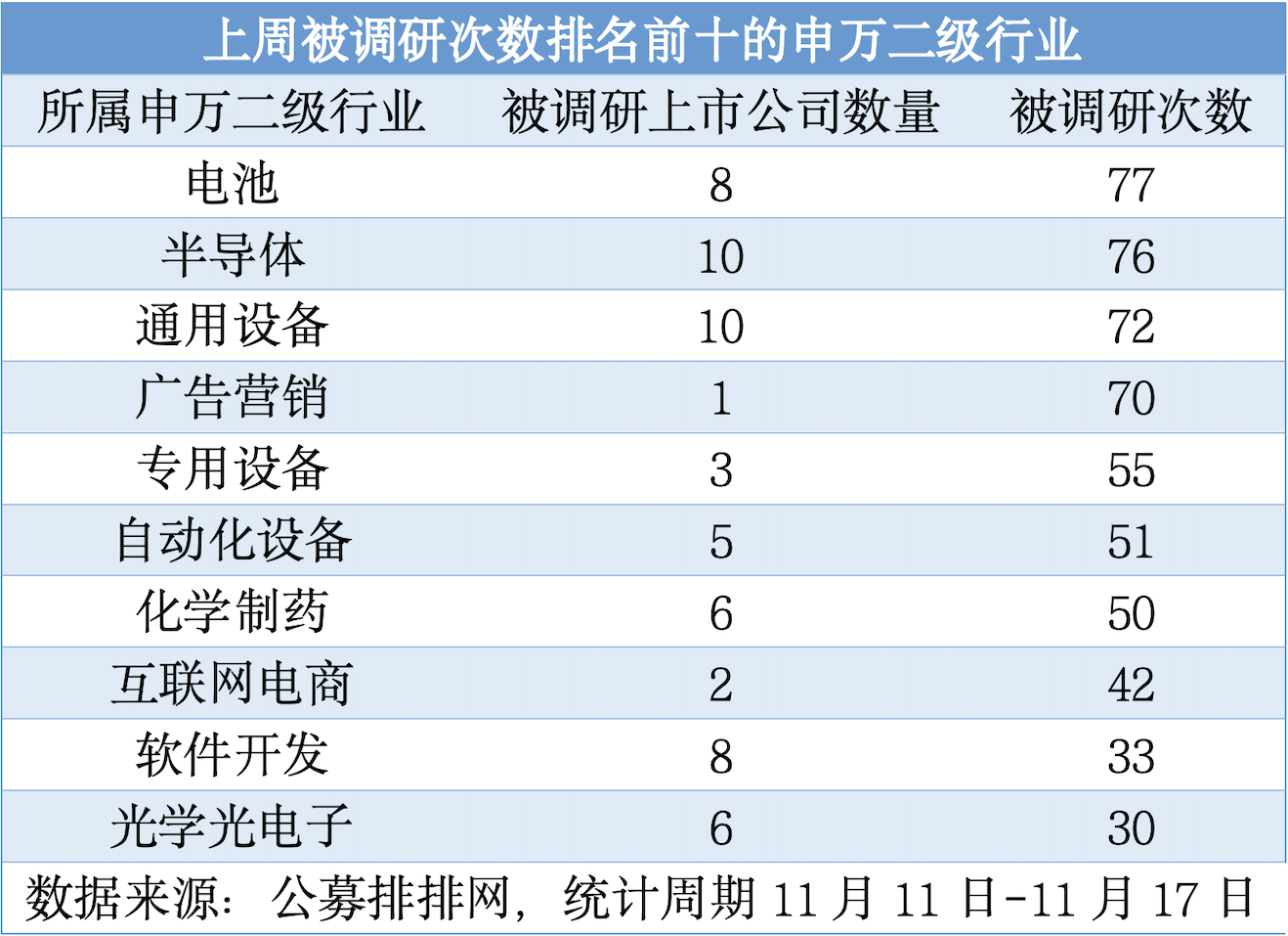 上周公募機(jī)構(gòu)調(diào)研覆蓋到62個(gè)申萬二級(jí)行業(yè),其中10個(gè)行業(yè)被調(diào)研不少于30次。