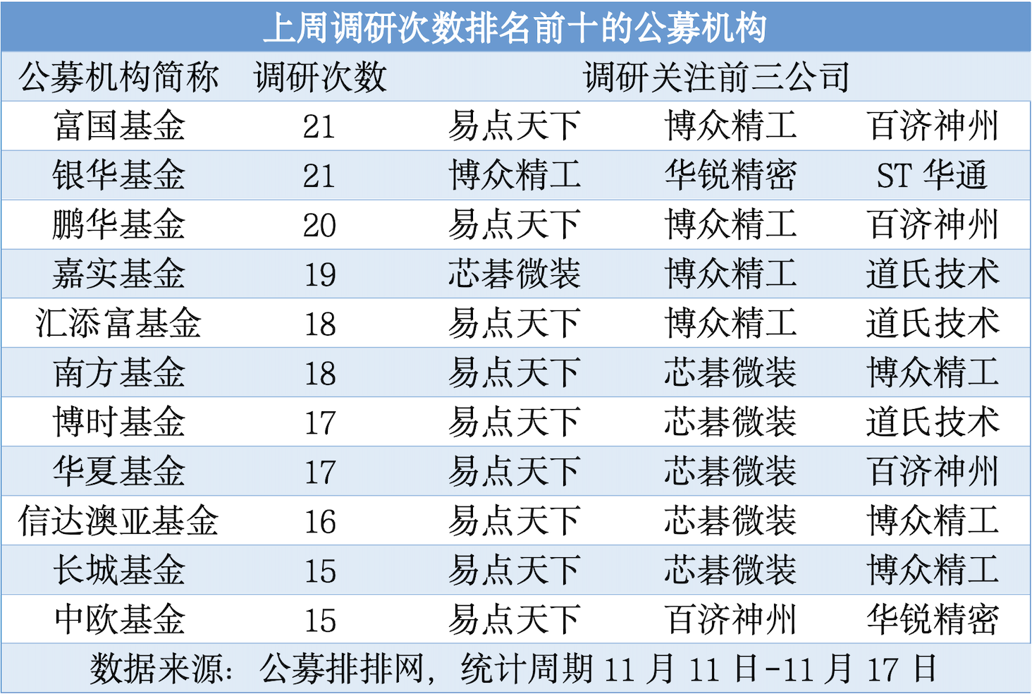 (上周調(diào)研次數(shù)排名前十的公募機(jī)構(gòu))