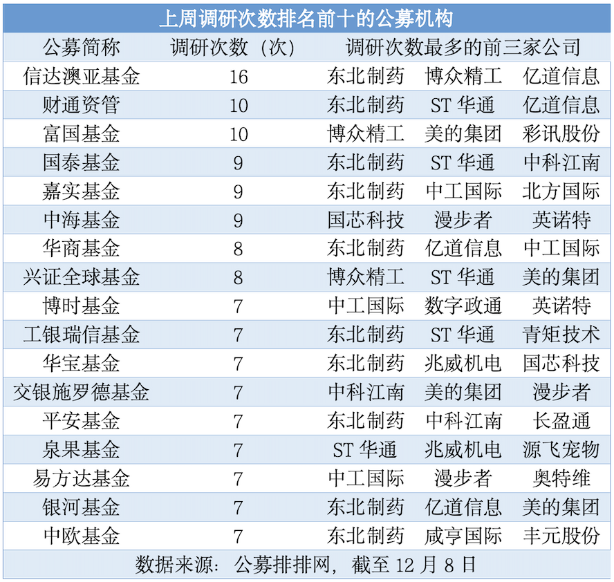公募排排網(wǎng)數(shù)據(jù)顯示,上周有117家公募參與到A股上市公司調(diào)研活動(dòng)中,89家公募調(diào)研不少于2次,其中3家調(diào)研不少于10次。信達(dá)澳亞基金上周調(diào)研16次居首。