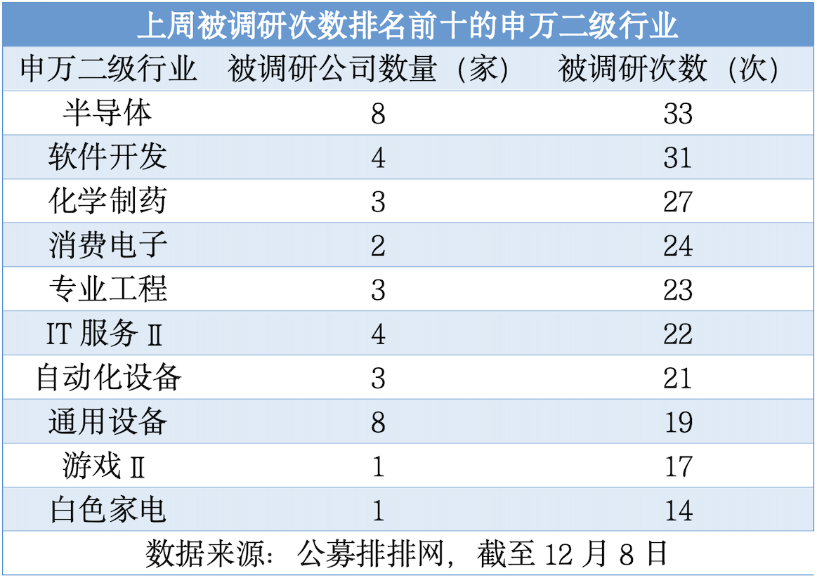 公募排排網(wǎng)數(shù)據(jù)顯示,上周(12月2日至12月8日),117家公募機(jī)構(gòu)赴103家上市公司調(diào)研,共計(jì)420次,其調(diào)研覆蓋到47個(gè)申萬(wàn)二級(jí)行業(yè),其中半導(dǎo)體行業(yè)最受青睞。