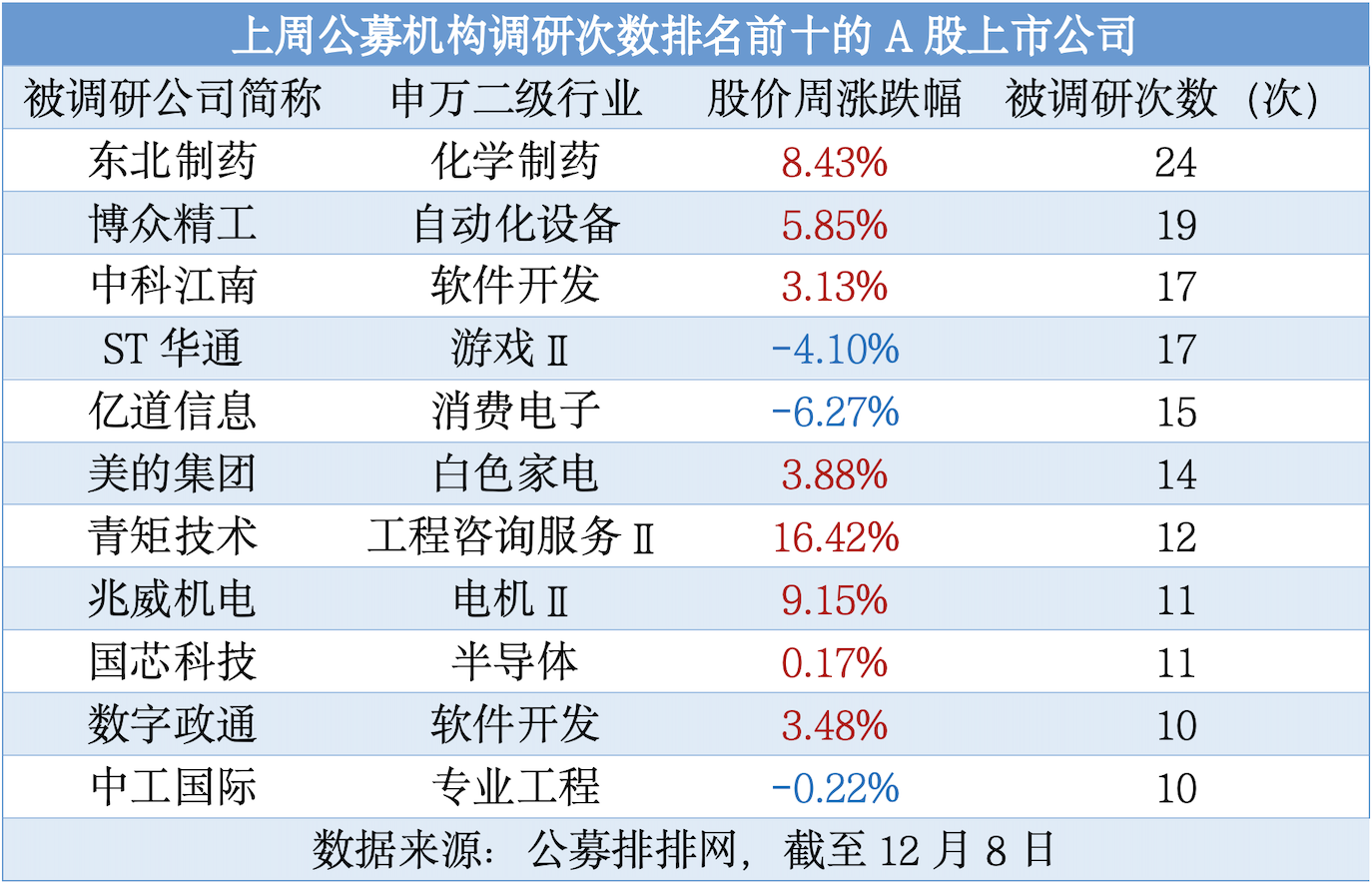 此外,博眾精工、ST華通、中科江南、億道信息、美的集團(tuán)、青矩技術(shù)、國(guó)芯科技、兆威機(jī)電、數(shù)字政通、中工國(guó)際等獲公募機(jī)構(gòu)調(diào)研次數(shù)居前。
